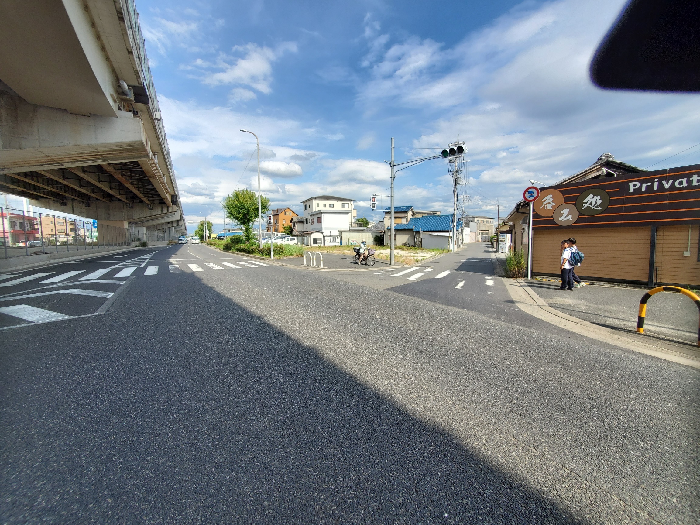 トラックの駐車場、一戸建て住宅、工場、倉庫などが混在している地域に位置